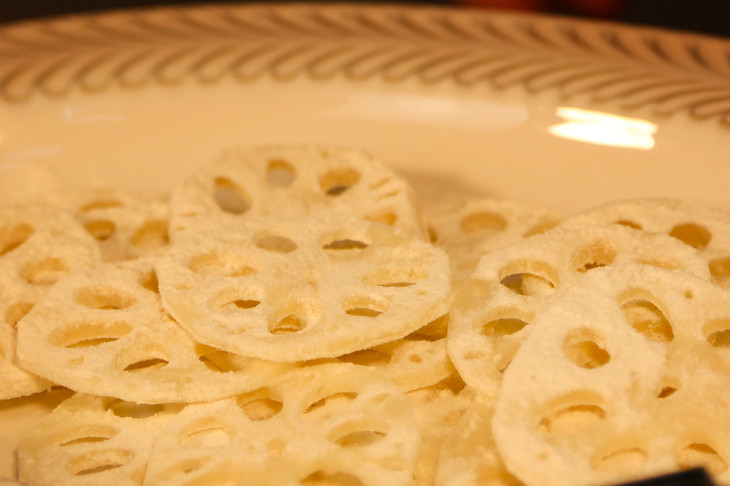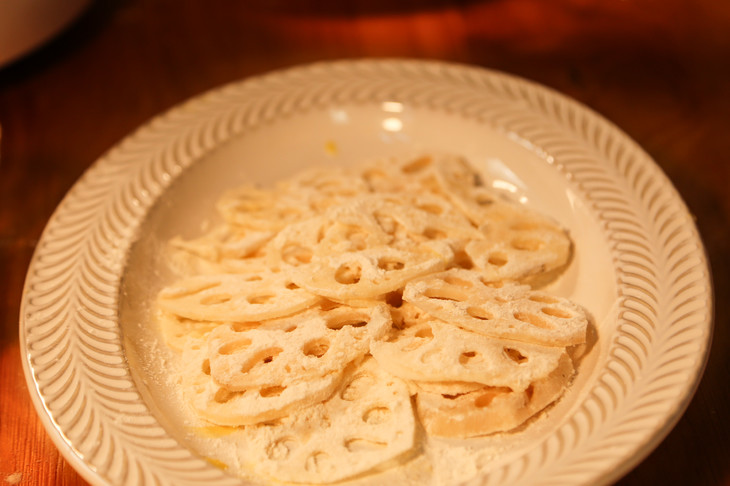 2、 将藕片均匀裹上一层薄薄的面粉;