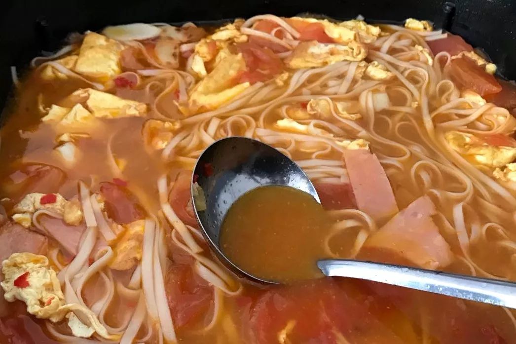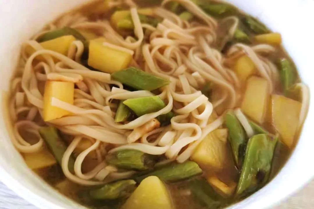三下五除二切几颗时令蔬菜,先炒至7分熟,再倒入水,水烧开之后,取上一把香畴面条,不一会儿就可以吃上热腾腾的一碗面了。