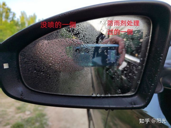 因为前挡玻璃的坡度较小,然后就拿后视镜再试了下效果,同样用擦车经遮挡部分后视镜,这下效果就很明显了,喷洒防雨剂处理过的部分水雾形成水滴流下,另一侧形成水幕附着在后视镜上,效果不错的。