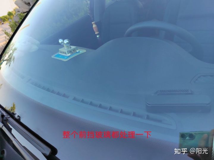 按要求擦干净后,拿装着清水的喷壶喷水雾(模仿毛毛细雨啦),可以看到两个不同区域的效果是不一样的,接下来对前挡玻璃做了个全面防雨剂处理。