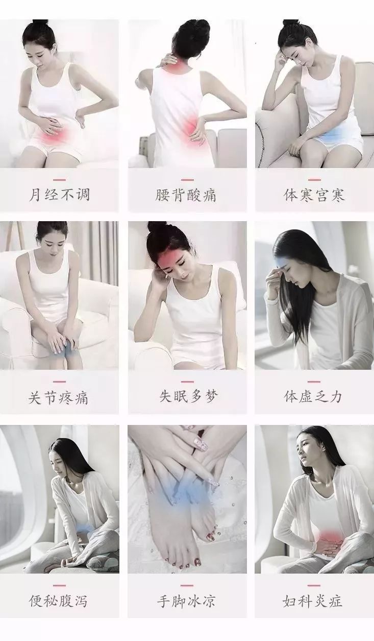 解决体虚乏力、失眠多梦,肥胖多湿、宫寒怕冷、月经不调、痛经、肩颈不适、乳腺增生、卵巢早衰、妇科炎症等各种身体毛病。