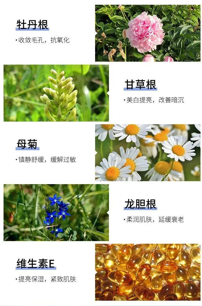 这得益于它添加的四重植萃精华:牡丹、甘草、母菊、龙胆。再配上维生素E,有效缓解干燥肌肤,改善肌肤粗糙状态,每次洗完清爽不紧绷!