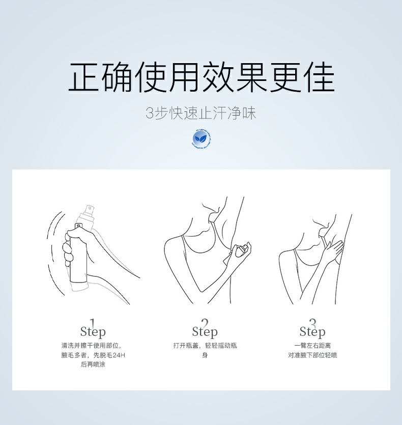使用方法很简单:先用清水清洗后擦干,再适量喷腋下(腋毛旺盛的建议刮净后再喷)就ok了!