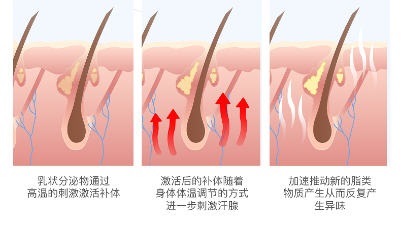 腋下汗液与细菌发生作用,产生了不饱和脂肪酸和氨,从而出现难闻刺鼻的异味。