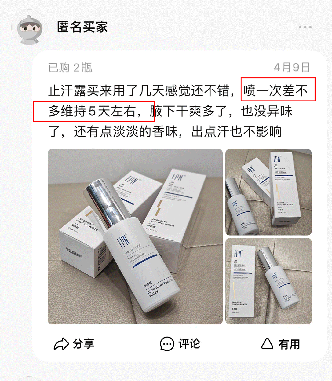 我昨天出门前还特意用了它,出门前喷一喷,尴尬的臭味不见了,腋下一整天干爽还自带体香~
