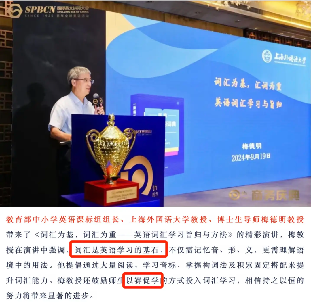 新课标中小学英语课标组组长梅德明教授在出席活动的时候就强调过,“词汇是英语学习的基石”。他也鼓励以赛促学,一定会获得显著的进步。