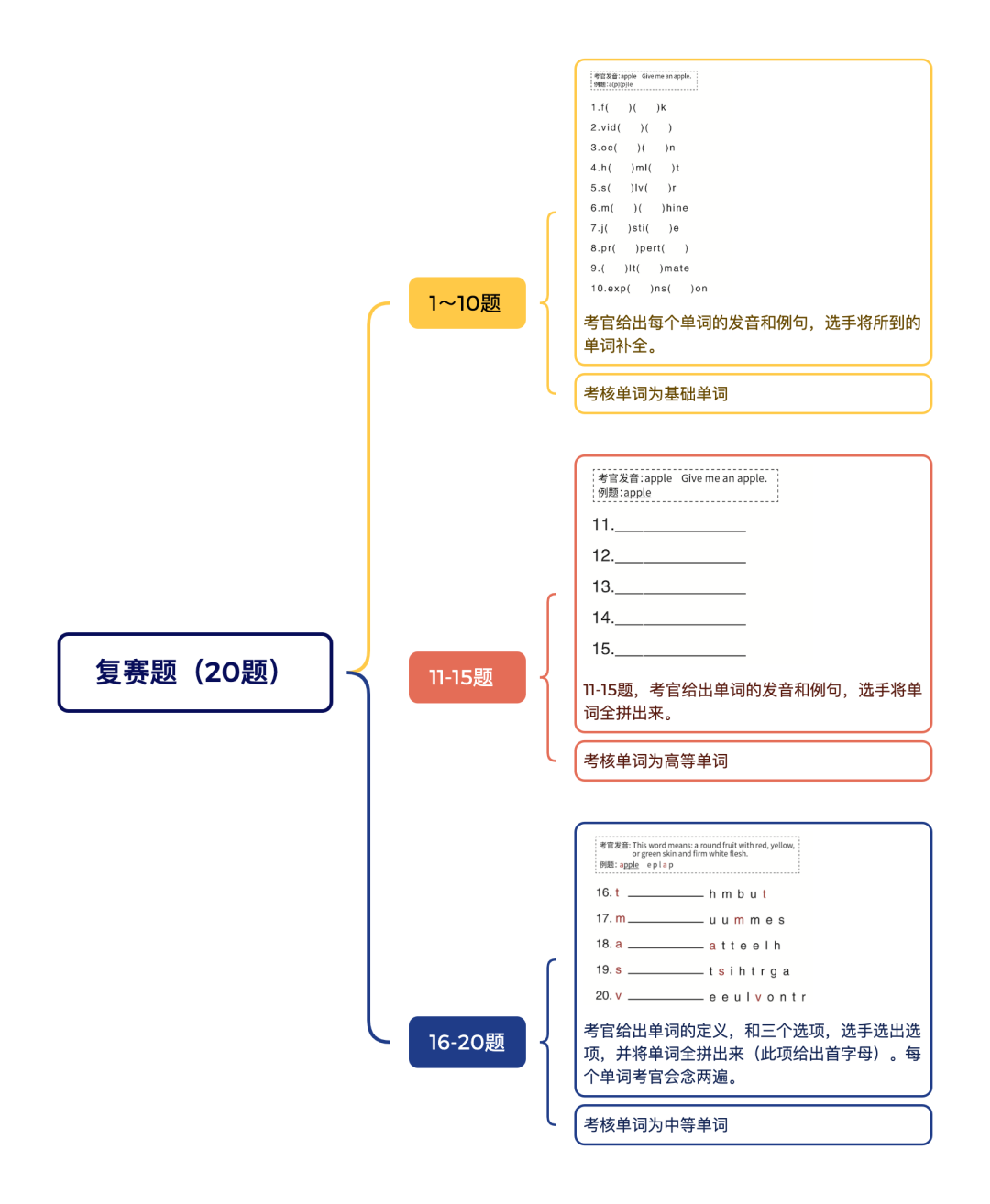比赛形式:各组别小组赛> 各组别小组复活赛>Top20无组别总决赛(现场拼词单轮淘汰)