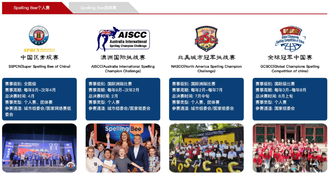现在Speling Bee已经不仅是一项简单的拼词竞赛了,更是一座各国青少年沟通的桥梁,NASCC(北美城市冠军挑战赛)以及ASBC(Speling Bee亚洲杯)等海外赛事的大门,也向来自中国的优秀青少年敞开!