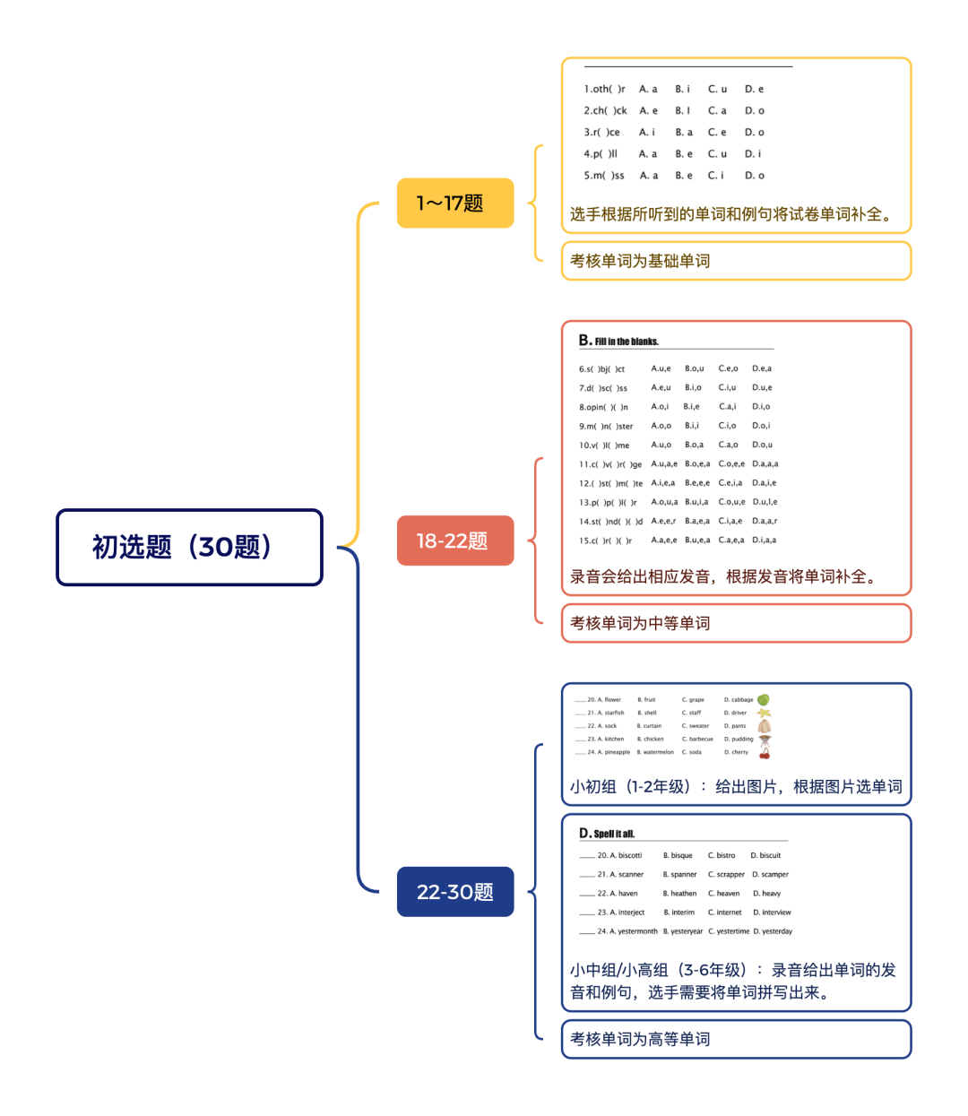 初赛的词汇范围为选手平时词汇积累为主,同时选拔出在词汇方面有一定积累和拼词技巧的选手。