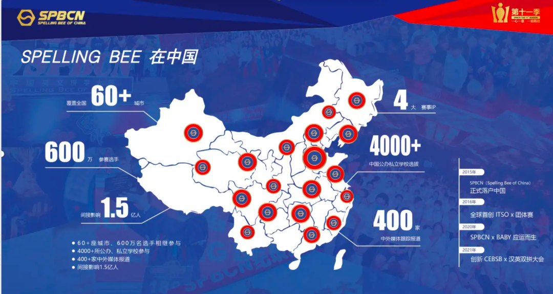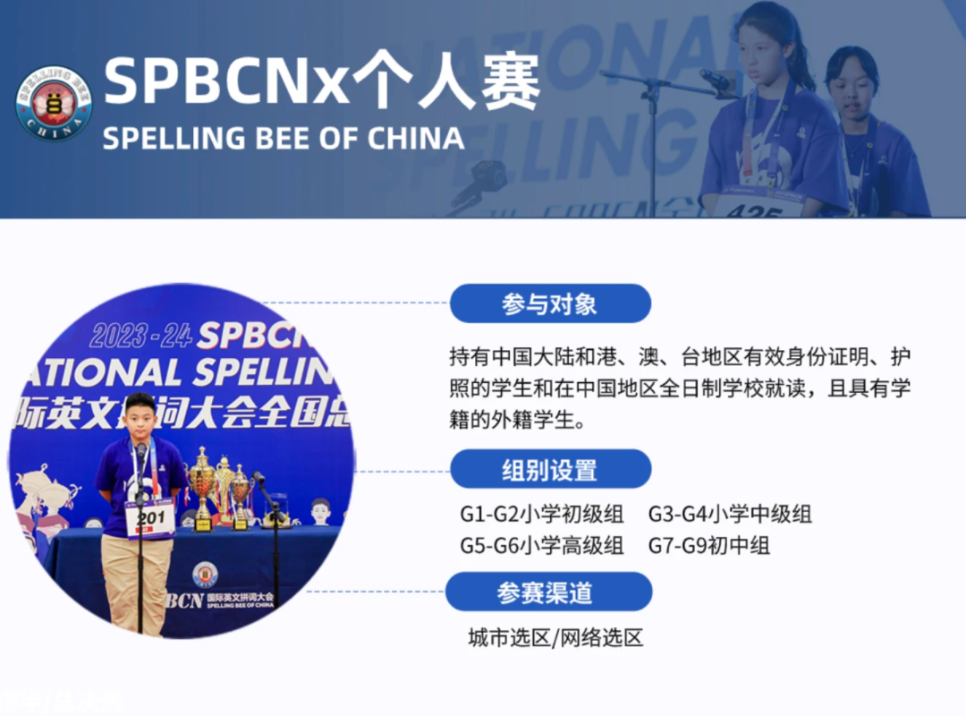 2015年,SPBCN(Spelling Bee of China)正式将这项有着将近100年历史的国际英文赛事活动引入中国,并已经来到了第十一个赛季。在新的赛季中SPBCN个人赛依然会沿用全球Spelling Bee拼词的形式:外籍考官给出单词的发音,选手在规定时间内将该单词拼出,同时可以向考官询问关于单词的问题,以便更加准确的进行拼读。每年自9月至第二年的8月为SPBCNX个人赛的赛季,来自全国各个城市的选手们,需要通过城市初赛、城市复赛、城市半&总决赛的逐轮选拔,最终可以来到一年一度的全国总决赛这是年度最高的拼词殿堂,无数个拼词者一年又一年坚持着,为心中的冠军而不断的努力。