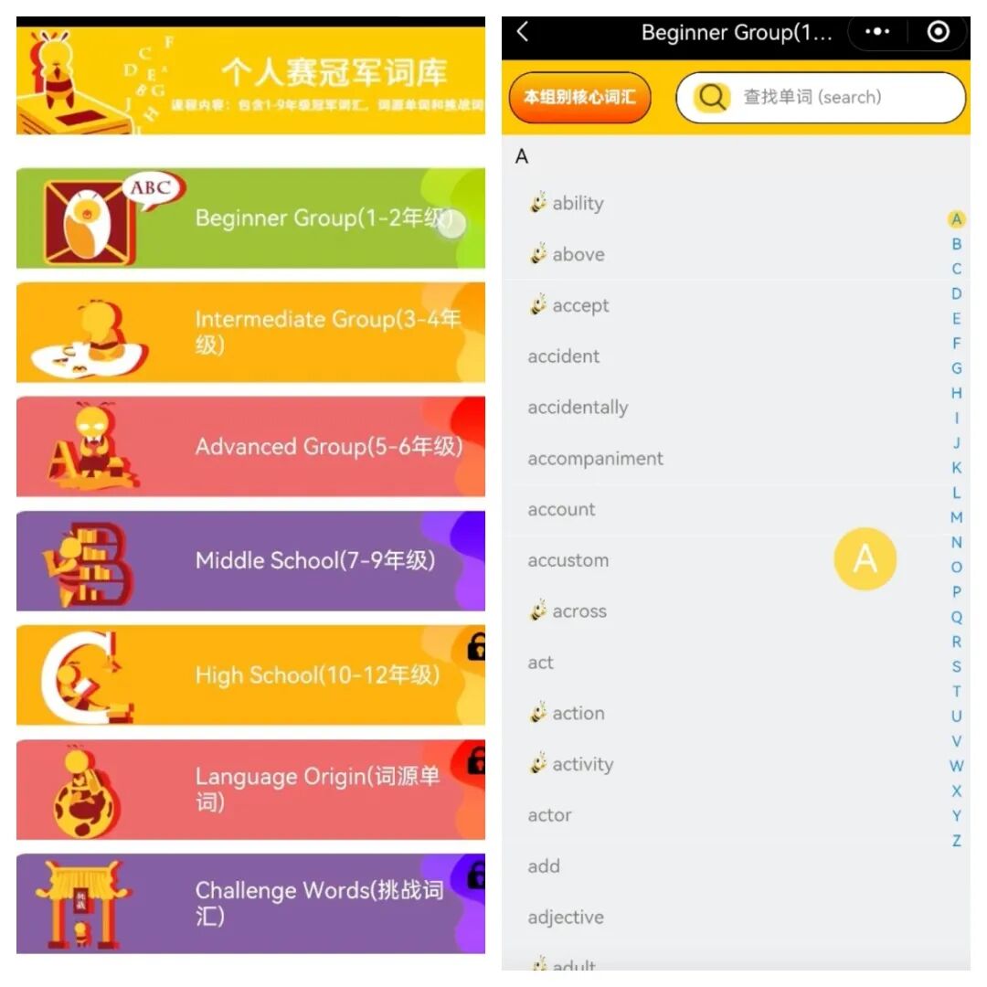 开通“蜂拥教育”小程序线上同组别词库(下图左边)。你们可以通过这个平台在拼读的同时进行听音辨音,为比赛做好周全的准备。