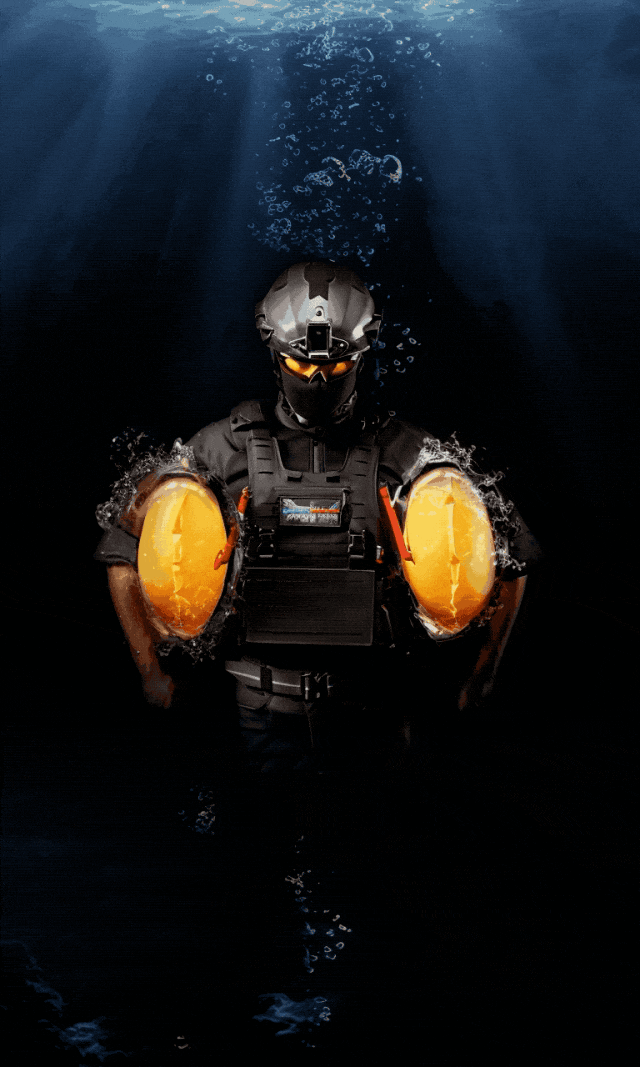 “河豚“的收纳包采用650D军规阻燃尼龙,具有防火、耐磨、抗撕裂的特点。浮力气囊材料为300D尼龙,具有防水、防腐蚀、耐磨损等特点,能在各种恶劣环境下使用。”河豚“提供不同深度下的浮力,支持使用者携带更重的装备负载。