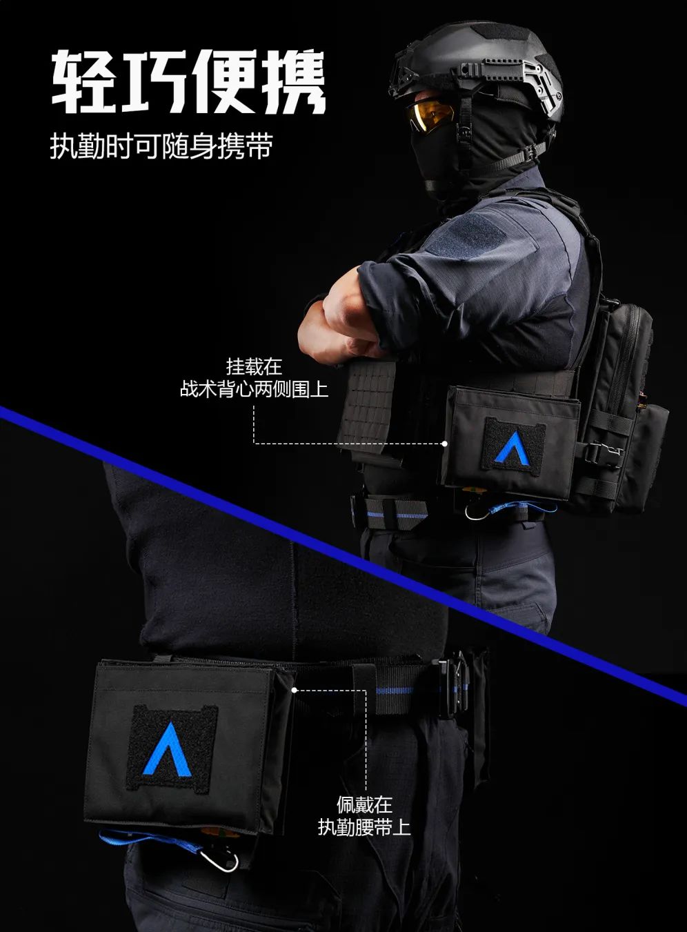 这套装置由左右两个独立的单元组成,可以挂载在执勤腰封或者战术背心等各类战术载具的MOLLE上,便于随身携带。单个独立单元在收纳状态时仅两个iPhone那么大,非常小巧轻便,外出行动毫无负担。