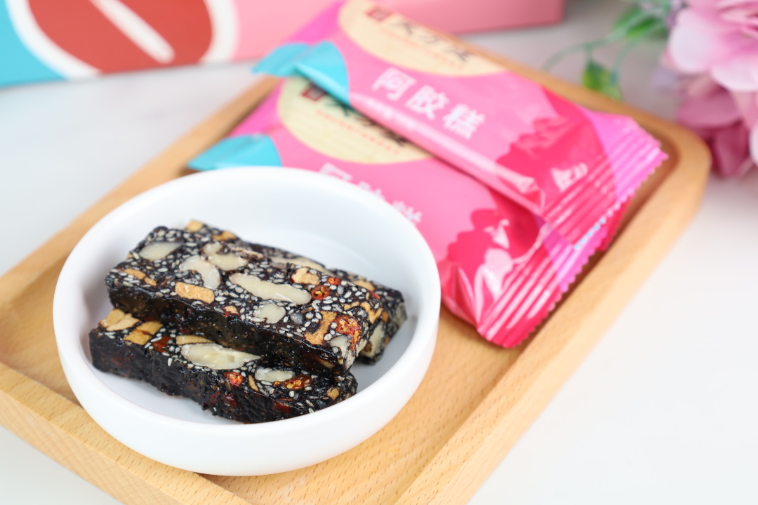 每一块「阿胶糕」的阿胶含量都高达10%以上,再配以黑芝麻、核桃仁、红枣、枸杞子、桑椹,采用无黄酒配方,以枸杞桑椹浓缩液熬膏,不额外添加糖,不额外添加黄酒,药食原料熬制!