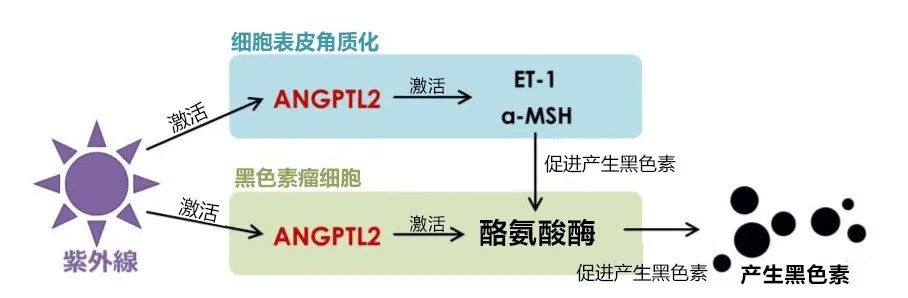 一般皮肤受到紫外线照射以后,是要通过内皮素和α-MSH去传输信息,信息传递到黑色素细胞那边后,才能开工。这个提取物主要就是在这个阶段起到作用,在内皮素和α-MSH传输信息之前,就把它们给挡住,那黑色素细胞实际上就不容易接受到信号,也就罢工了。