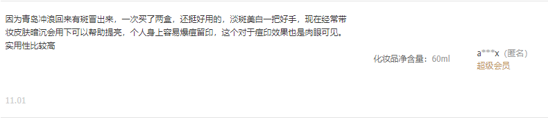 综上所述,被称为“美白皇后”也是实至名归。无论是肤感、配方、还是实际使用效果都是站在金字塔顶端的选手。