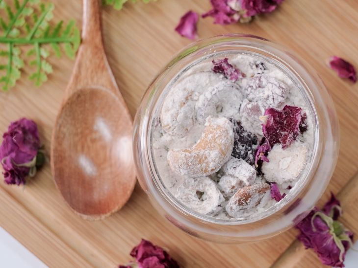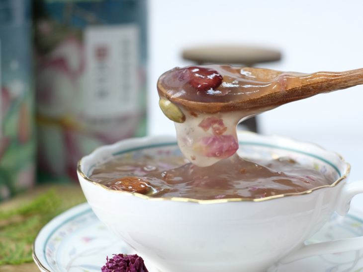 玫瑰花芳香浓郁,主疏肝解郁,调节心情,配上营养丰富的坚果和果干,能满足日常所需的蛋白质、维生素及微量元素。