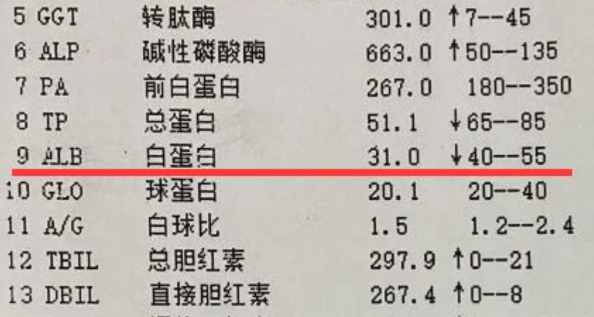 白蛋白可以反应肝脏的合成能力。当肝功能受损时,肝脏合成能力随之下降,进而导致白蛋白浓度下降。白蛋白水平低于正常范围,这可能提示肝脏存在损伤。若白蛋白低于25g/L称为低蛋白血症,可能存在腹水的情况。
