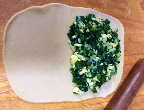 3、把和好的面下成乒乓球大小的挤子(40克左右),擀成椭圆形大片(一定要薄,拿起来透亮就行),拿个勺子把鸡蛋、虾皮、韭菜慢慢拌匀(用一点拌一点),然后把拌好的馅放到面上包好,再捏上花边;