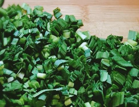 2、韭菜摘洗干净放到小盆里站着控水15-20分钟,根切掉顶刀切末,放入50-60克凉的熟豆油拌匀放到旁边备用;