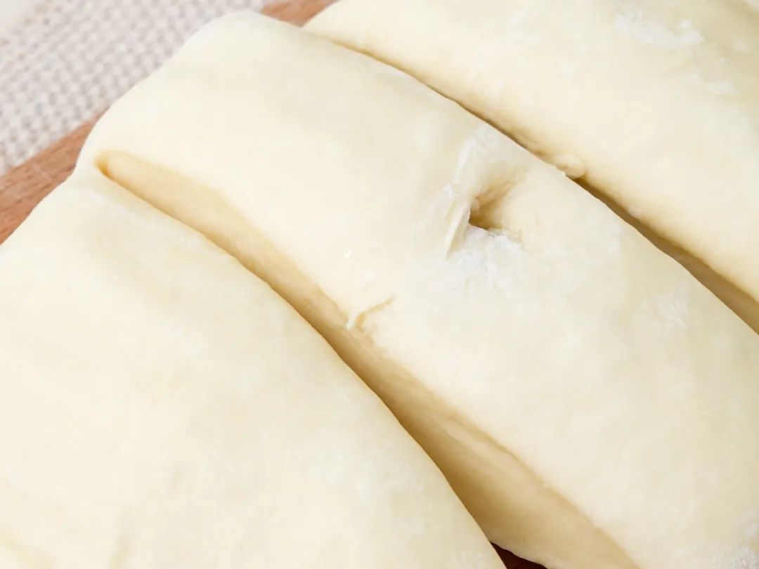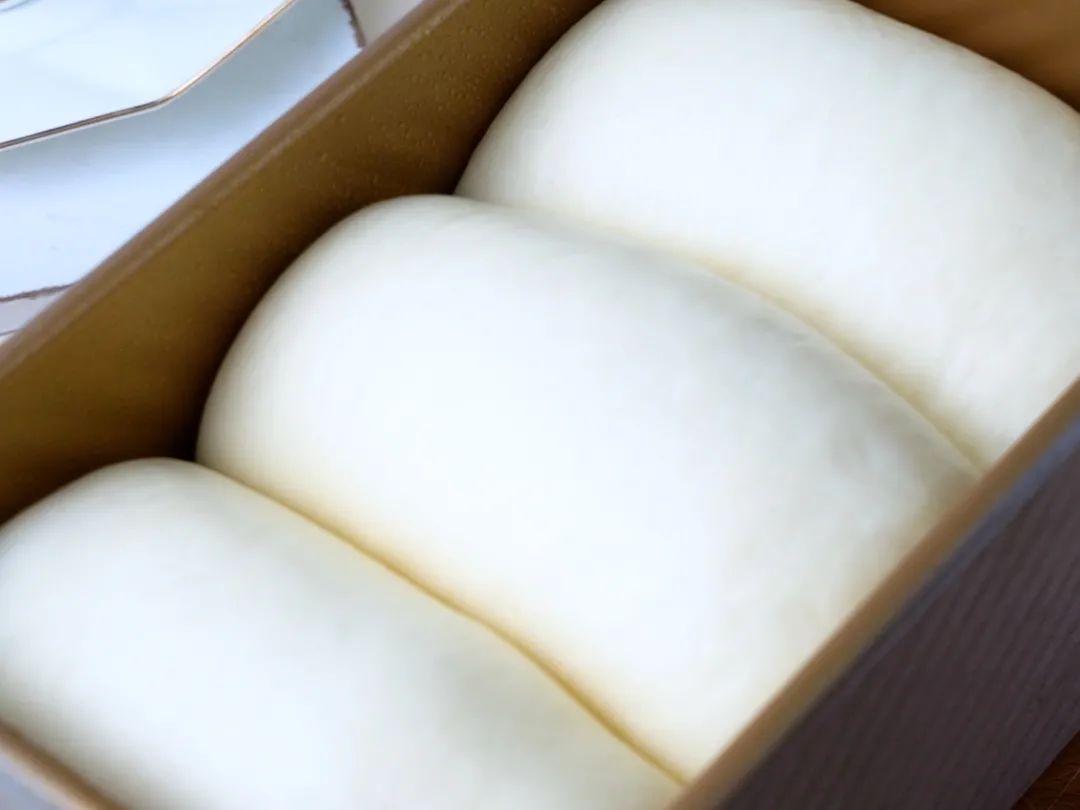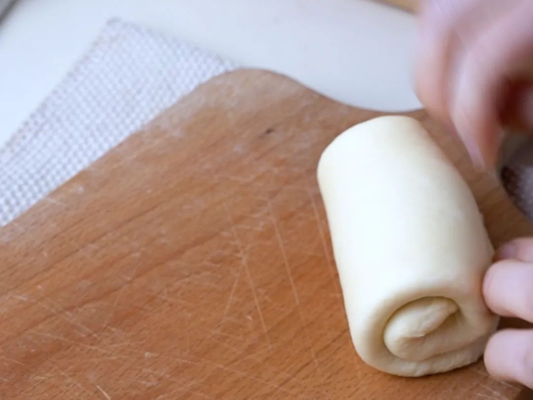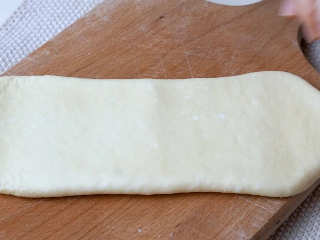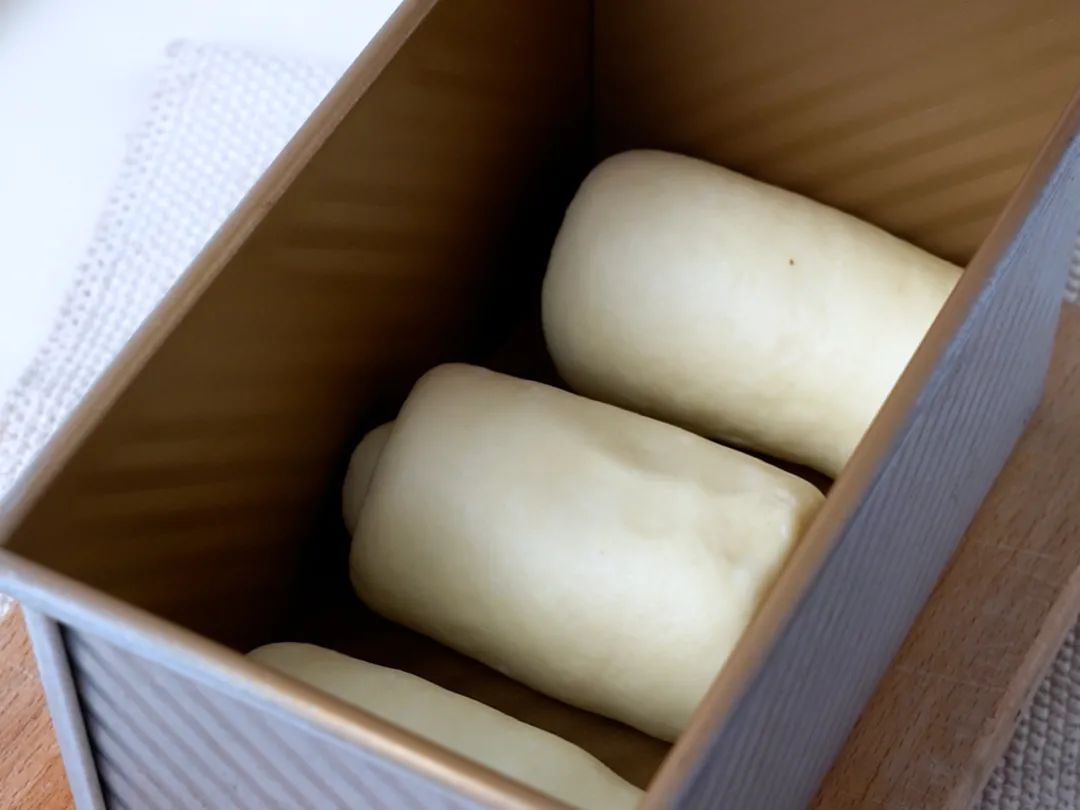 5.面团擀成长条状卷起,重复两次对面团进行整型,放入模具进行最后的发酵