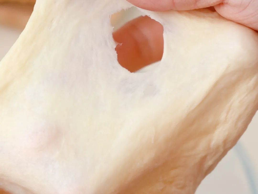 3.面团包裹黄油再次揉制面团,可拉出薄膜即可,盖上保鲜膜,进行一次发酵