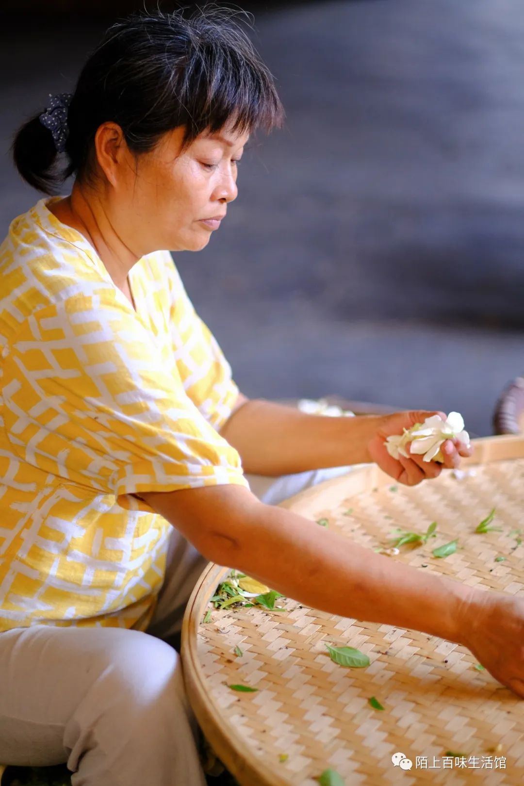 当我们走进魏师傅放茶的屋子,我就再也挪不动脚步了。虽然为了茶叶和花的香气更好融合,不能开空调降温,虽然在四十多度的高温下,我的脸上身上都是汗温,但置身花香和茶香中,我的心却慢慢平静了!魏师傅说,从十二岁开始,每年的三伏他都在这里做茶,年年如此!虽然又热又累,但他很享受!每年三月,魏师傅都会选自家茶山种的头春福鼎大毫一芽一叶为茶坯,条索紧实、叶尾舒展肥厚,富含氨基酸,然后再把这福鼎银针存上三年!每年七八月,魏师傅选花汛期的四川犍为茉莉鲜花,于晴天下午3点后人工采摘。如此,花朵大,洁白,香韵极佳,且营养更多。当天采摘的茉莉花蕾在晚上9、10点相继开放,倾吐香气。