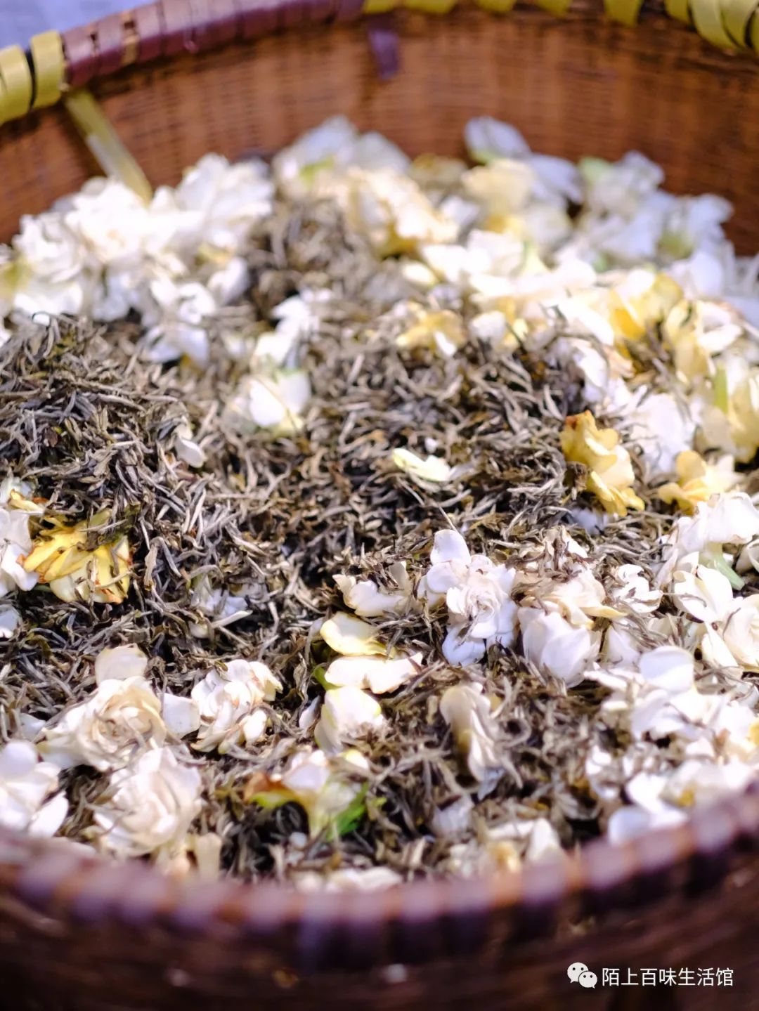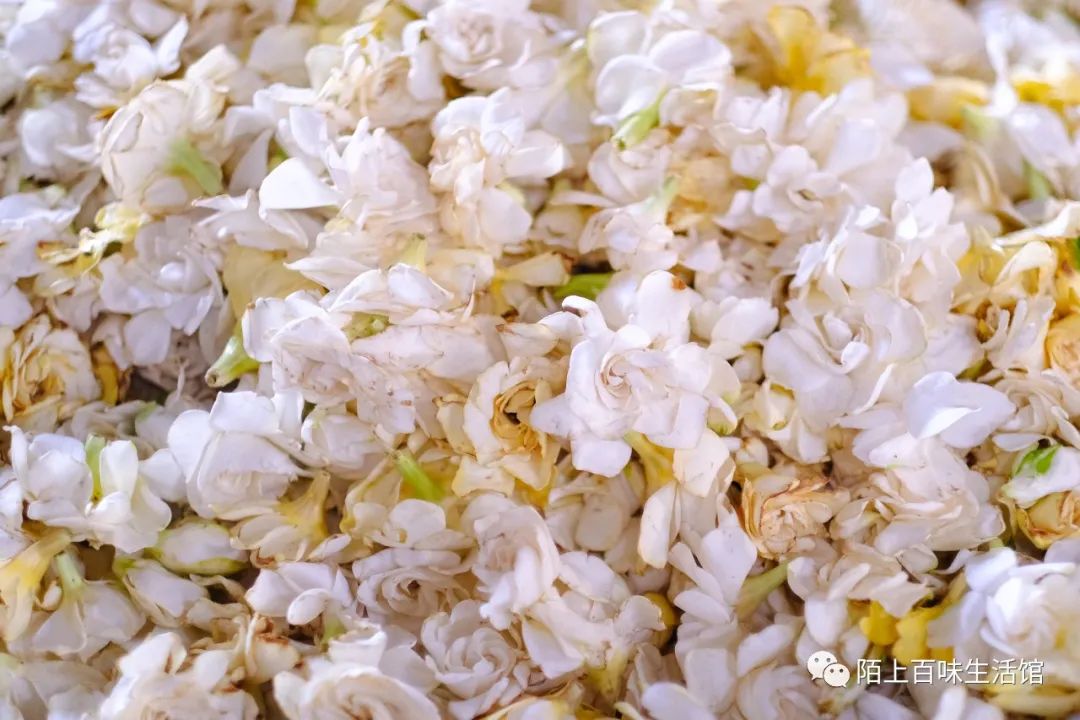 再把存放三年的福鼎银针和茉莉花一起窨制,必须从开花的当晚11点左右开始,持续到次日清晨。窨后烘干茶叶,等待3日,才能开始第二次窨制。因此,茉莉花的窖制,需要15天左右。同样的方式,栀子花要进行五次窖制。三年福鼎老白茶,要经过两种不同的花共八次窨制,需要30多天,才能转化馥郁花香!