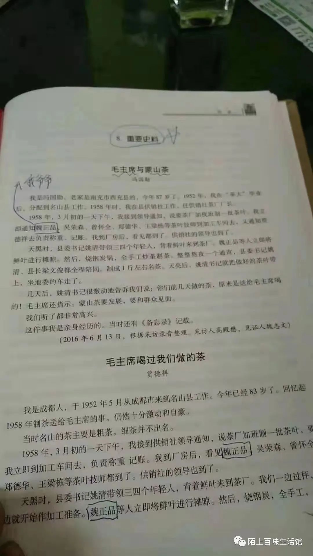 交谈中我们了解到,魏正品老师傅跟毛还曾有一段缘分。1958年,魏正品老师傅作为最好的制茶师傅,为正在成都开会的毛炒茶。毛喝过魏老师傅的茶之后,称赞到:“蒙山茶比我家乡的茶好,要大力发展!”