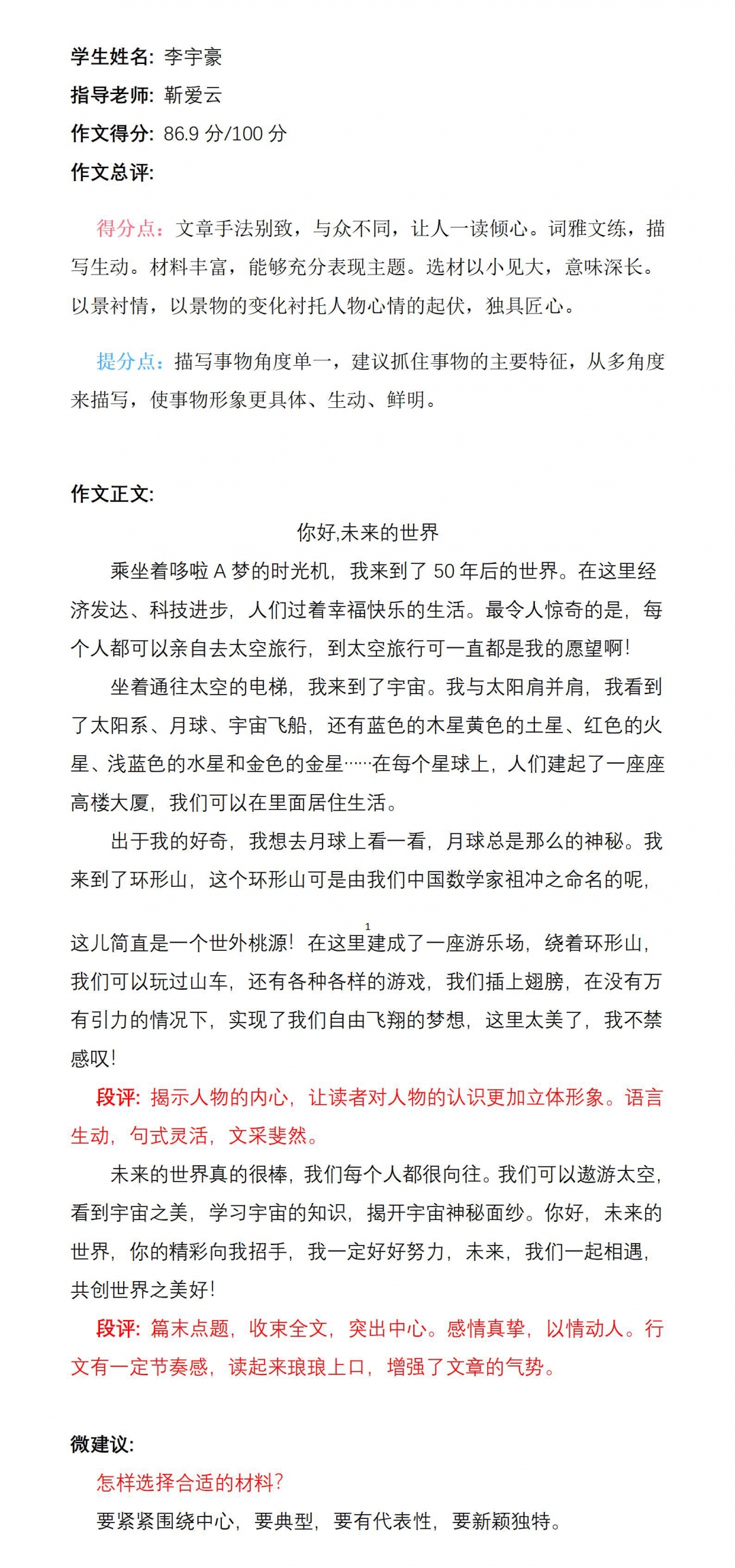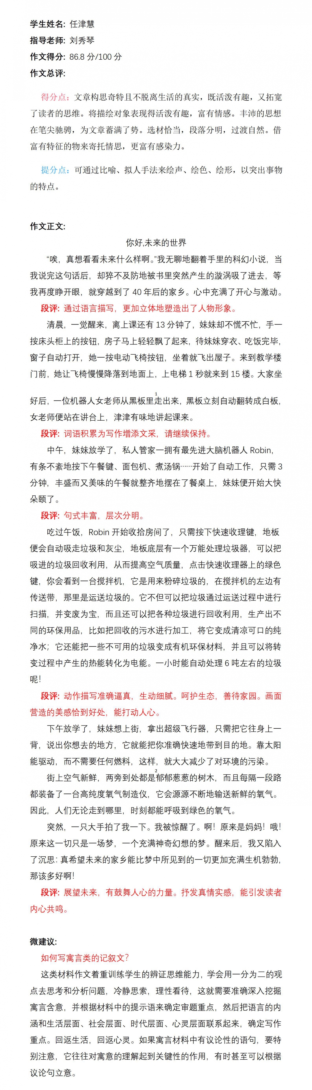 首先,老师为你在这次创新作文中获奖而点赞。孩子的心灵纯洁无瑕,孩子的眼光独特创新,孩子的思维丰富多彩。“生活中不是缺少美,而是缺少发现美的眼睛”。愿你有一双发现美的眼睛,善于观察,勤于思考,敢于想象,勇于探索,在知识的海洋里畅想遨游,在写作道路上越走越远。老师一路支持你,加油!