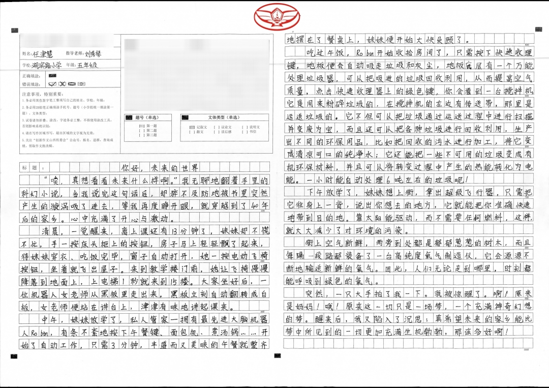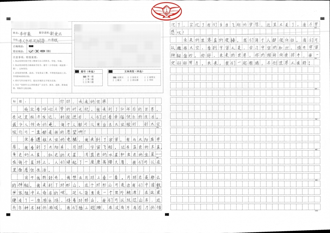 你是一个积极向上、活泼开朗的阳光女孩,你想象力丰富,特别喜欢读书,看到优美词句,就会自觉摘记下来,灵活地运用到习作中,你的习作经常被当作范文读给大家听。老师希望你能把这次创新作文取得的优秀成绩,当作前进的动力,在写作之路上越走越宽!加油!老师一路支持你!