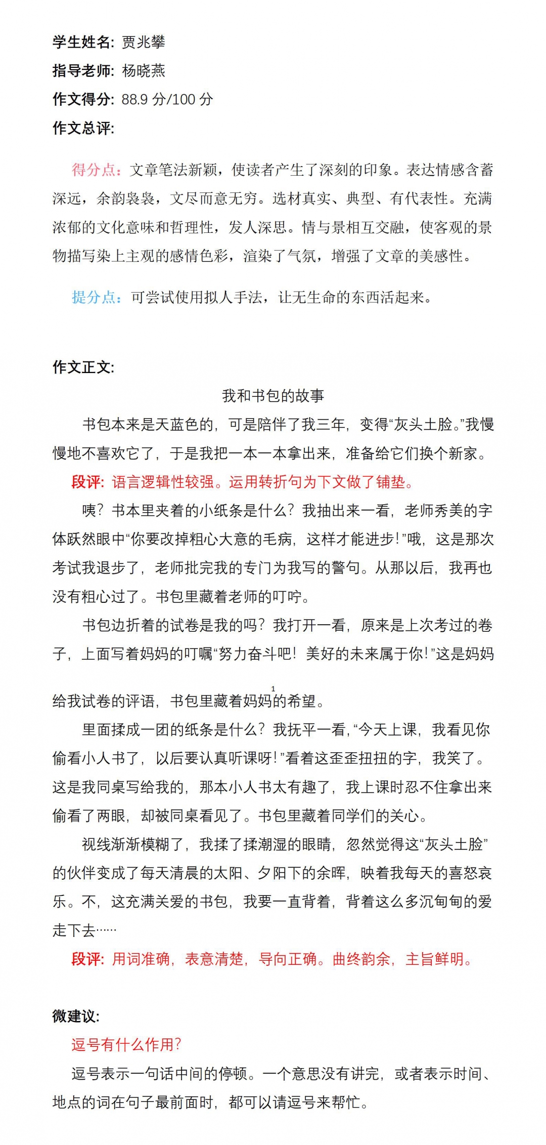 你是一个聪颖、爱阅读、善于思考的孩子,想象力也很丰富。写作上既源于生活,又高于生活,还不失童趣。老师希望你在阅读的海洋中尽情遨游,在写作之路上尽情挥洒,将你的喜怒哀乐用美丽的文字传达给万千读者。相信你一定行,加油!