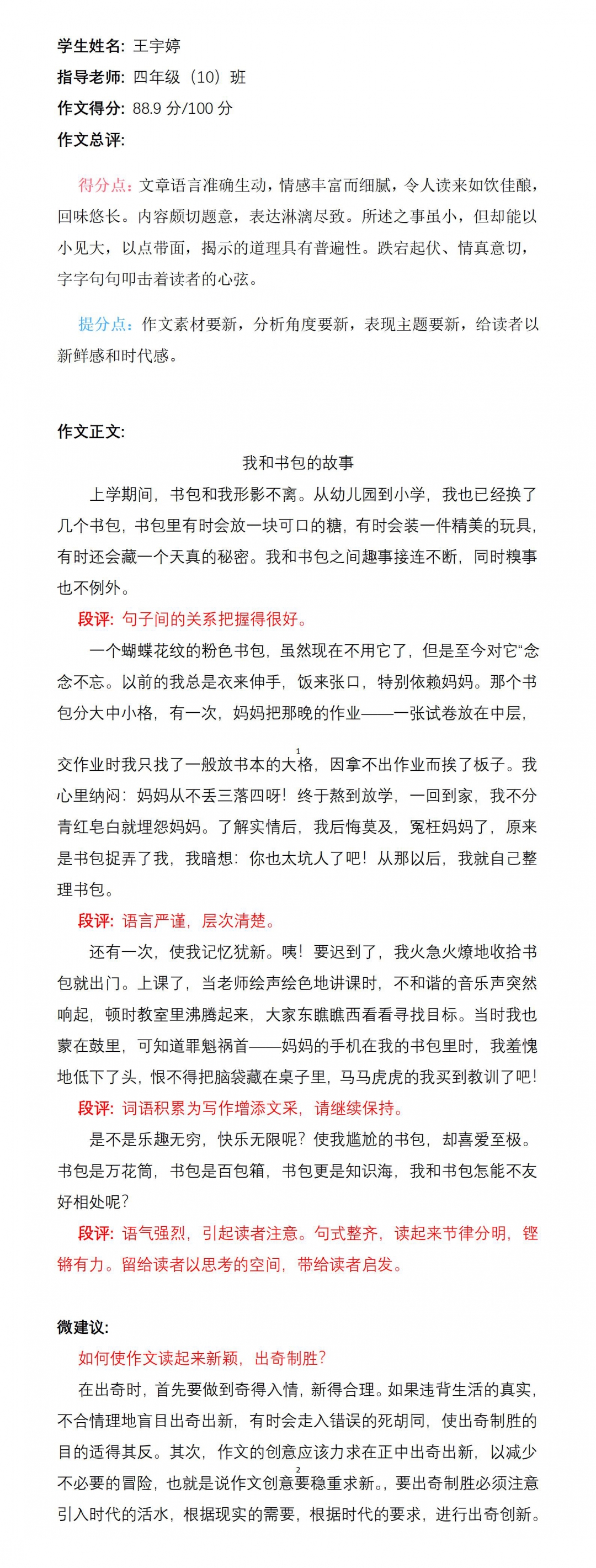 你像一只闪烁奇光异彩的独特小鸟,你的作文构思新颖,内容丰富。老师希望你以这次“创新优秀作文”为起点,在写作之路上继续放射光芒!加油!老师看好你噢!