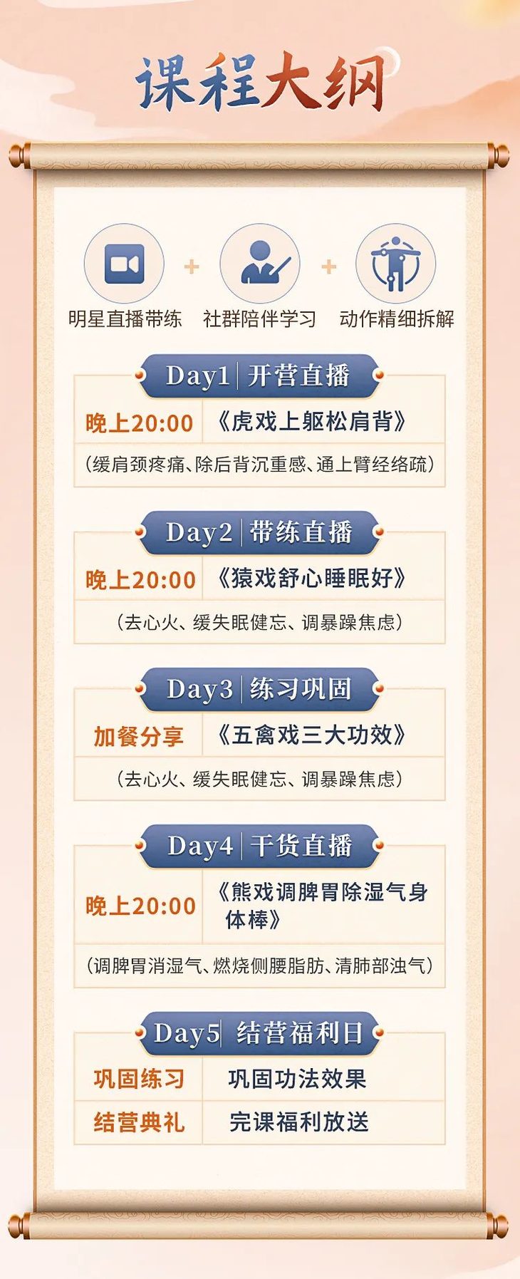 五禽戏养生营,到底有多值?作为非遗传承人,华一选择开设网络课程的原因只有一个:为了让五湖四海的朋友都体验到五禽戏的精髓,并且从中解决自己的健康困扰,本次的【华佗五禽戏脏腑养生营】可谓下足了功夫: