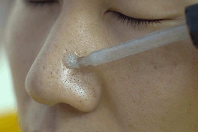 将反孔精华,滴在鼻子上,缓慢揉搓,很快就能看到一层被吸出的污垢。