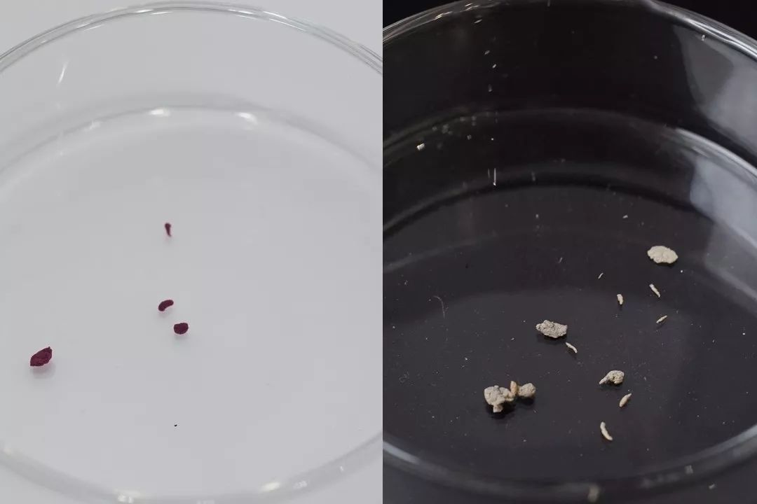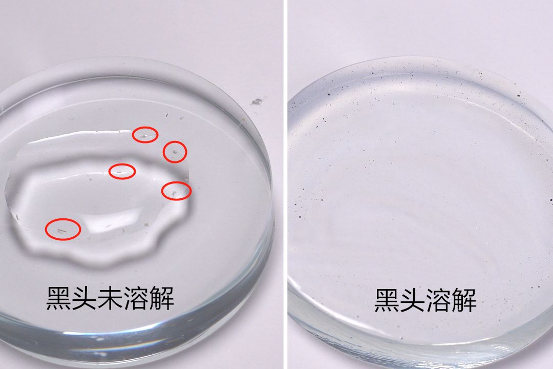 轻轻揉搓两个器皿后,左侧器皿黑头完好无损,而右侧器皿中的黑头迅速溶解。