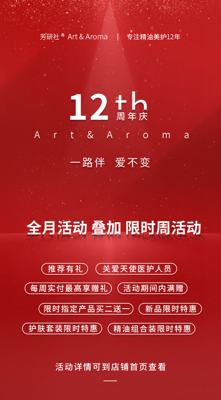 #12周年店庆#芳研社12周年店庆钜惠来啦,有丰富的活动内容,精油组合和护肤组合套装,更有全月活动叠加限时周活动,满足不同需要的你,快点来看看吧~