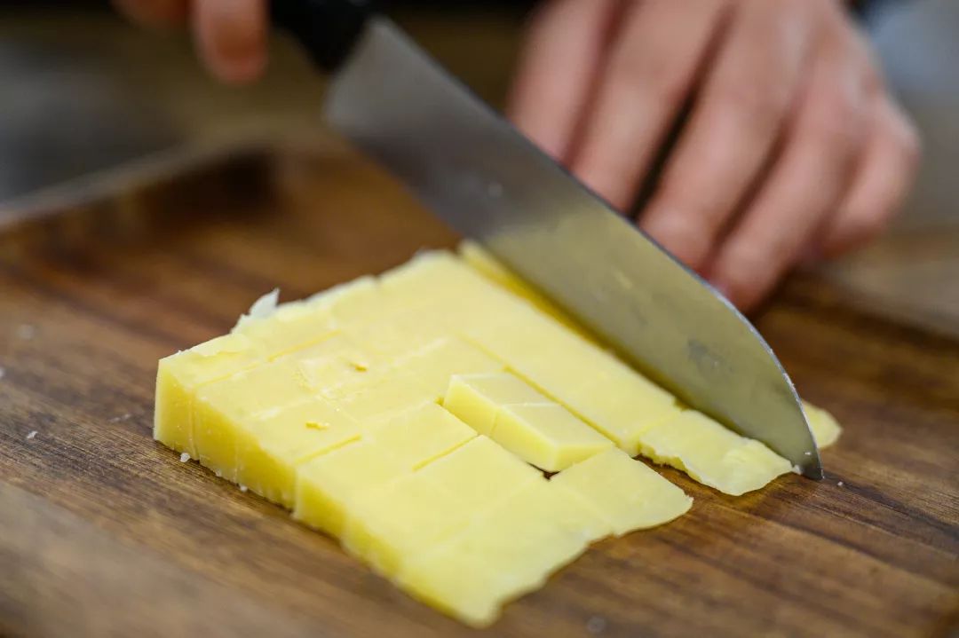 注意,为了使奶酪保持原有风味,每切完一种奶酪,都需要将刀清洗干净。