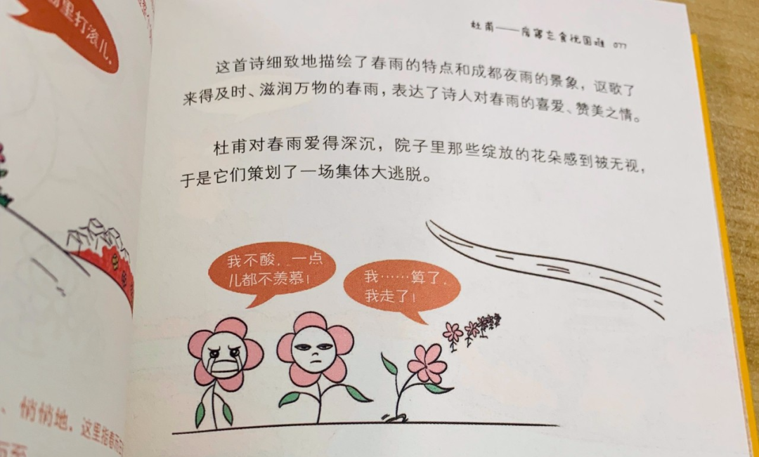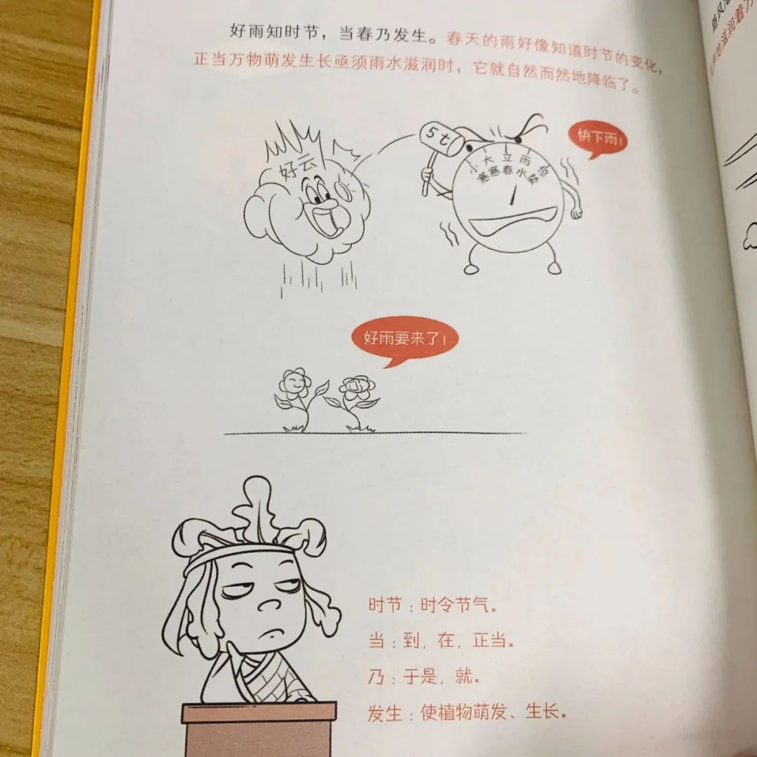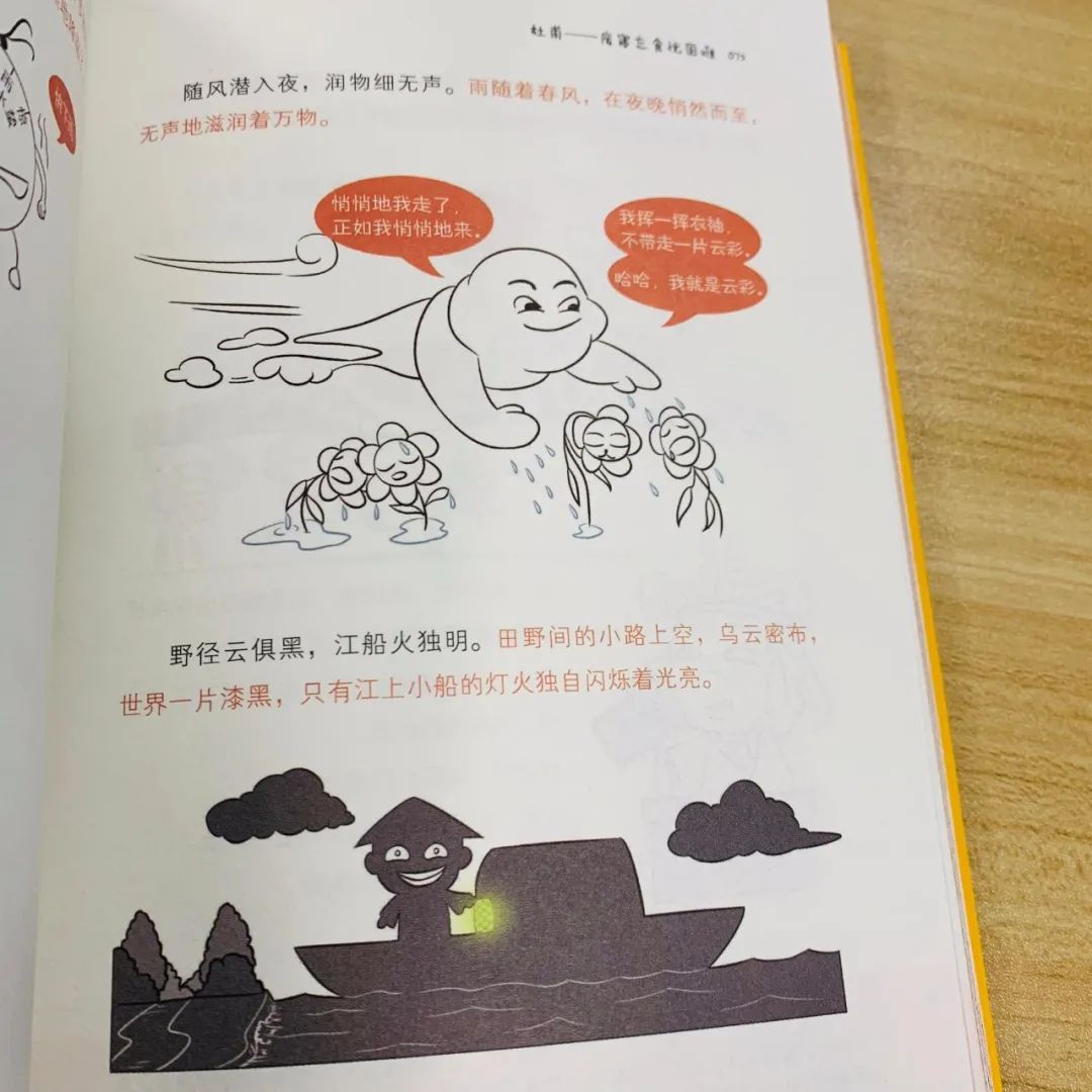 其次每一句故事都有生动形象的漫画来解释,这里将“好云”“时节”,甚至是花草都拟人来表现诗句想要表达的意思。▼