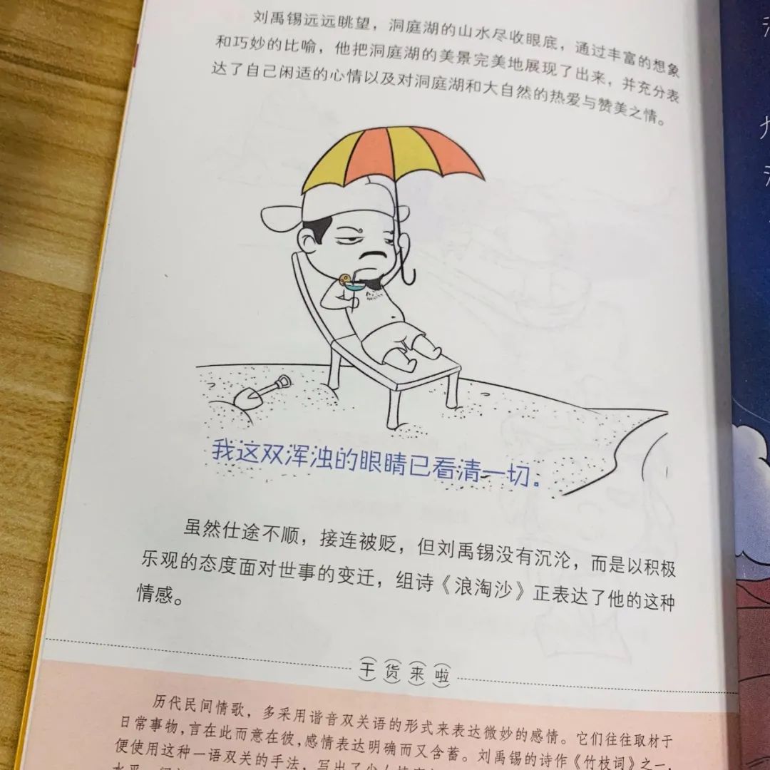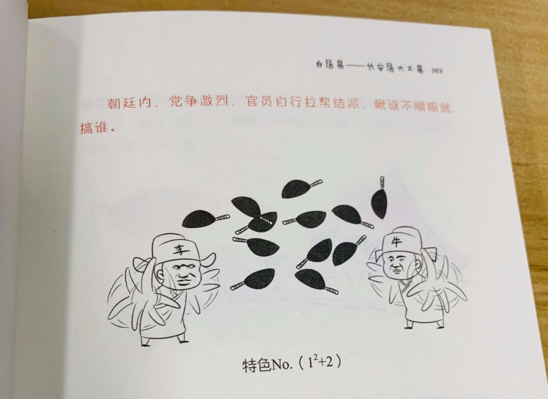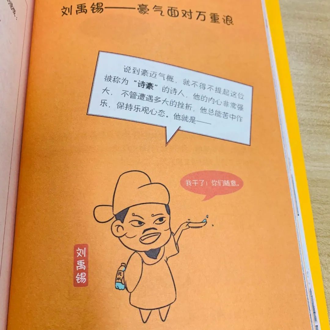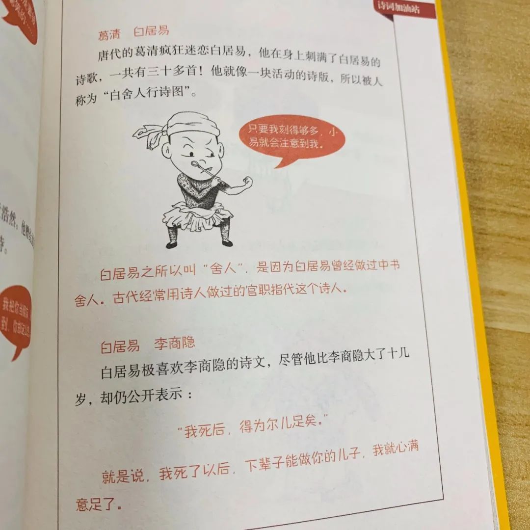 比如说讲到白居易,从“新乐府运动”讲起,通过有趣的漫画将中晚唐的三大特色形象的表现出来,让孩子在看漫画的过程中不知不觉的接受到诗人的时代背景和创作背景。▼