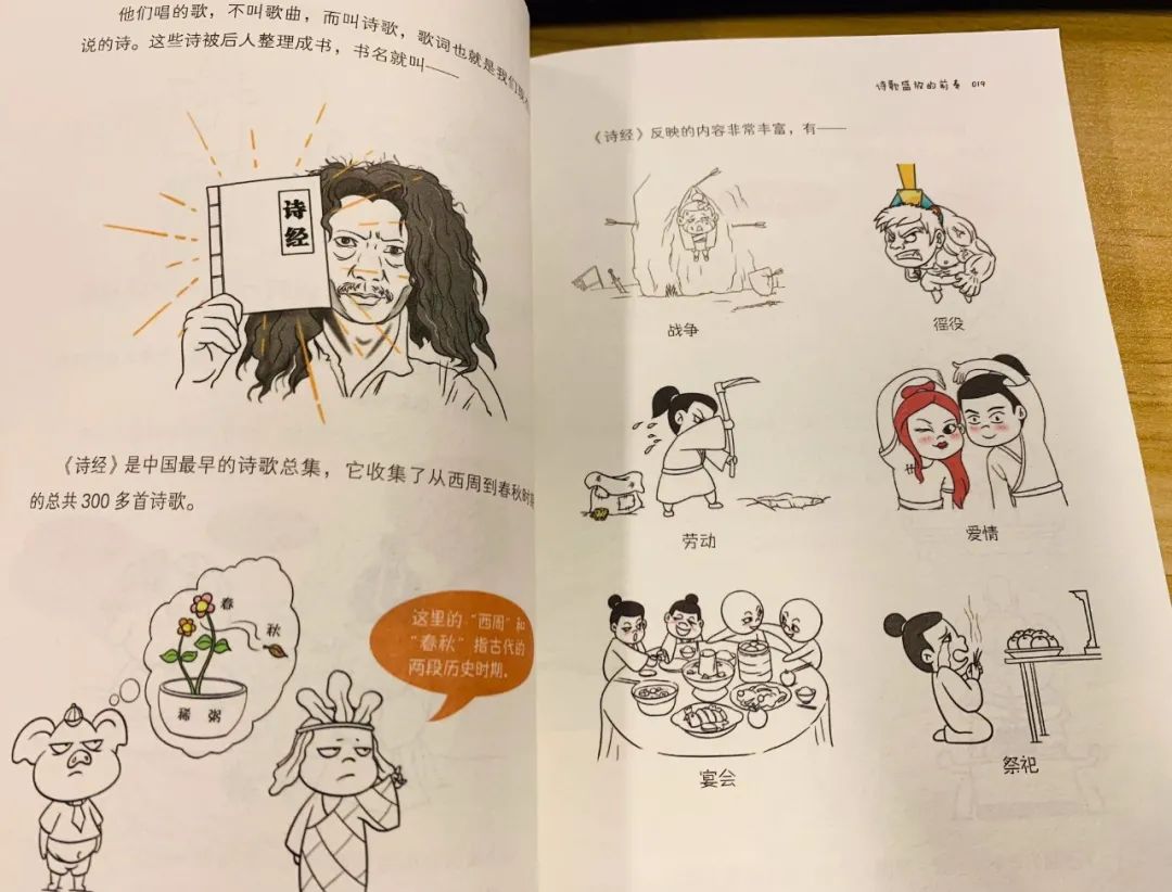 每一首诗,也都用数幅漫画来解读呈现;漫画夸张,好玩,十分有梗。
