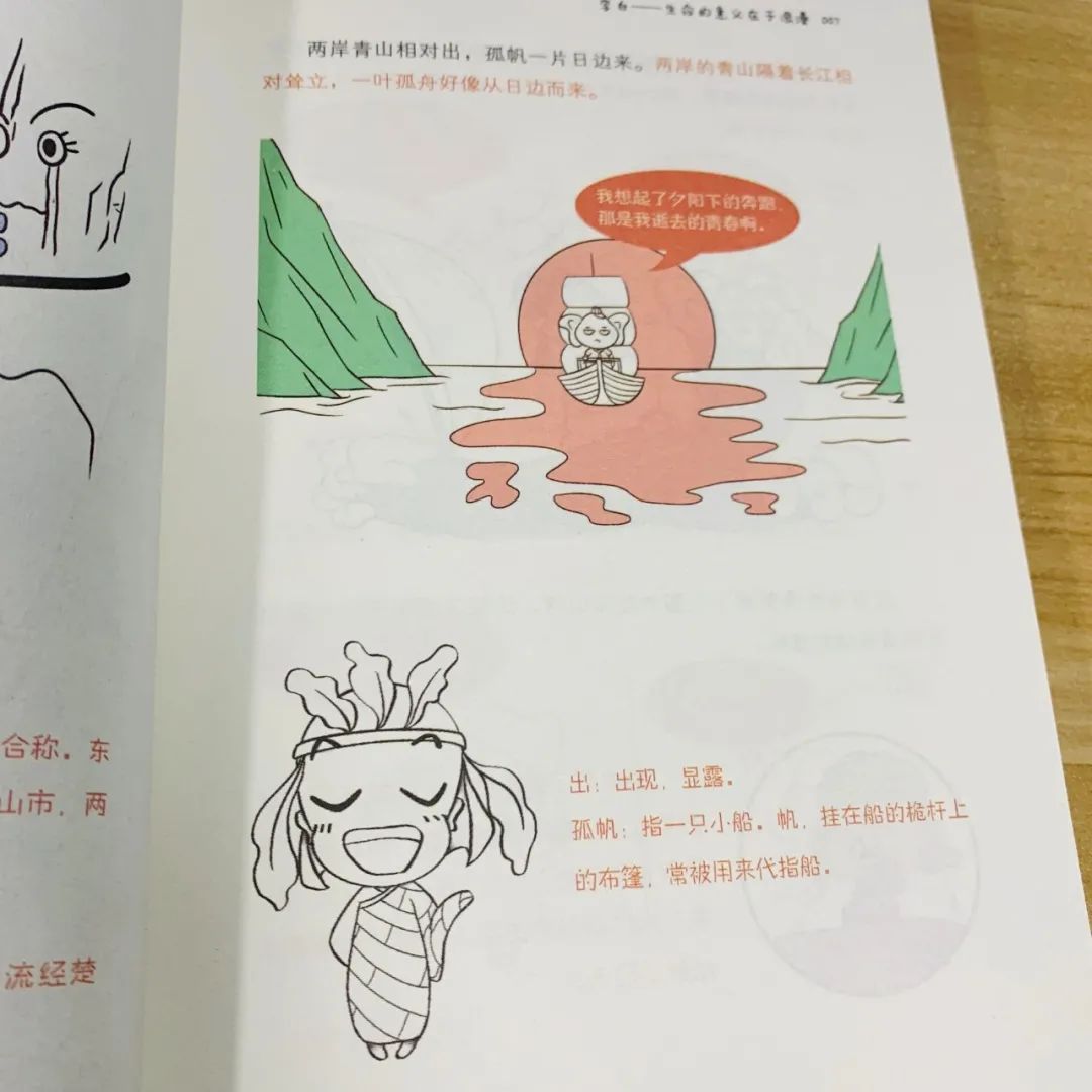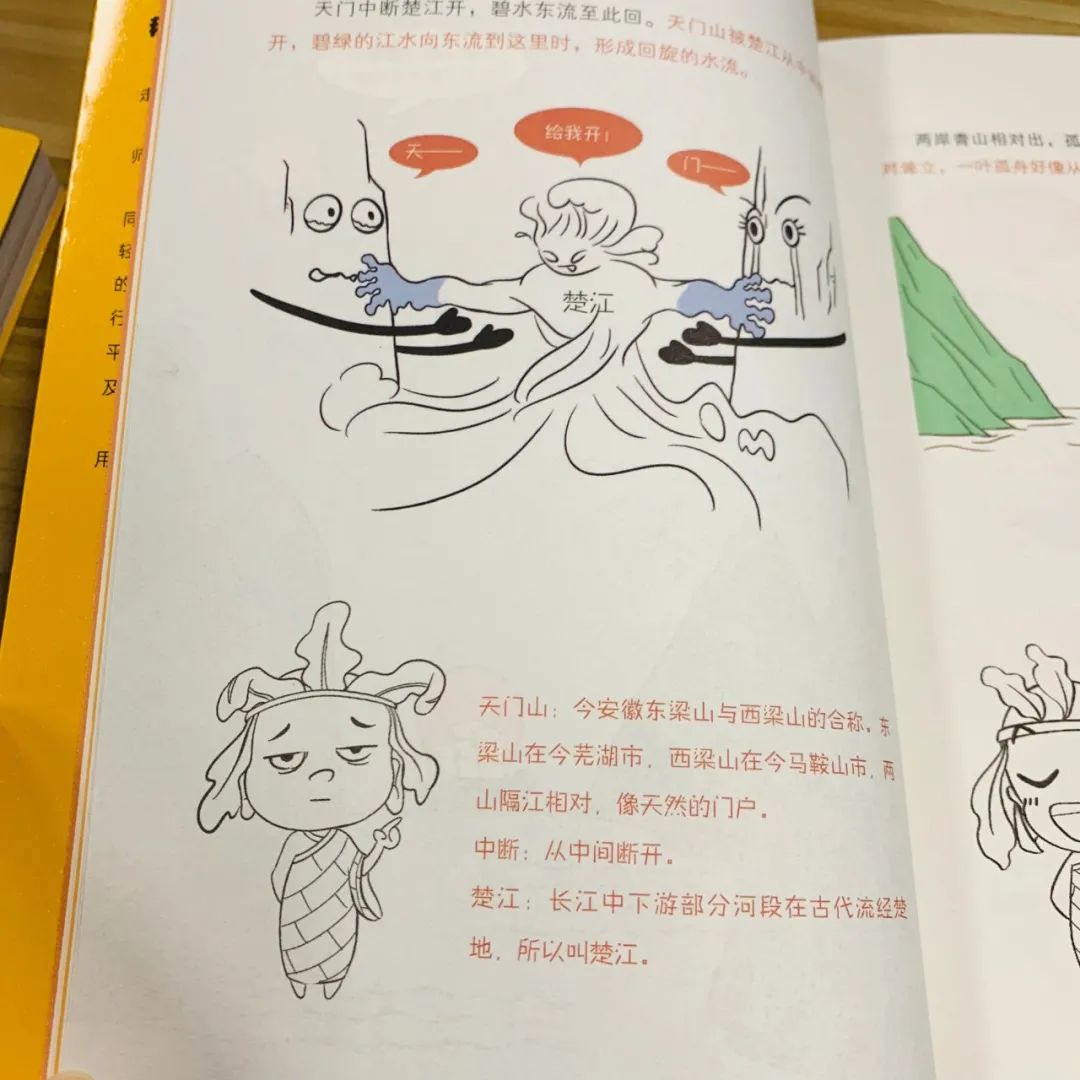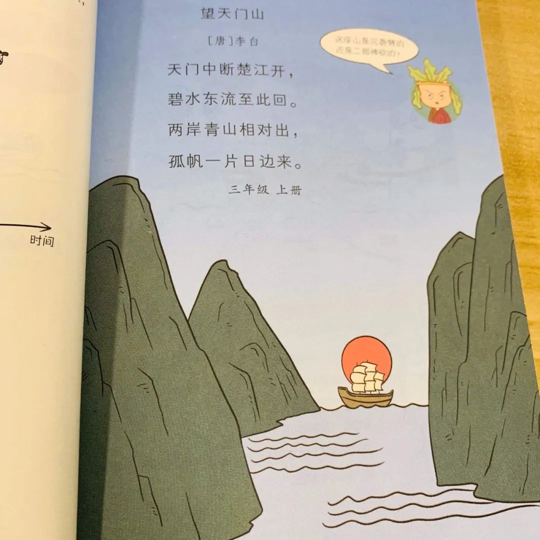 并且每首诗的解读也都是通过漫画来讲解的,在他的名篇《望天门山》,先是给出了原文,在搭配一副写景的图,让孩子对整首诗有个大概的印象。▼