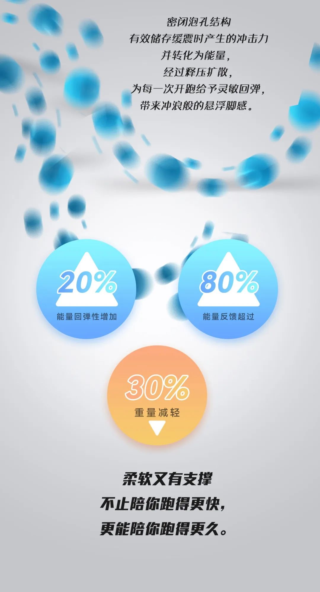 超临界发泡E-TPA带来了更优异的脚感和享受,它具备出色避震与高效回弹,其能量回馈可以达到80%,比爆米花缓震科技高约20%,拥有更棒的吸震缓冲效果。