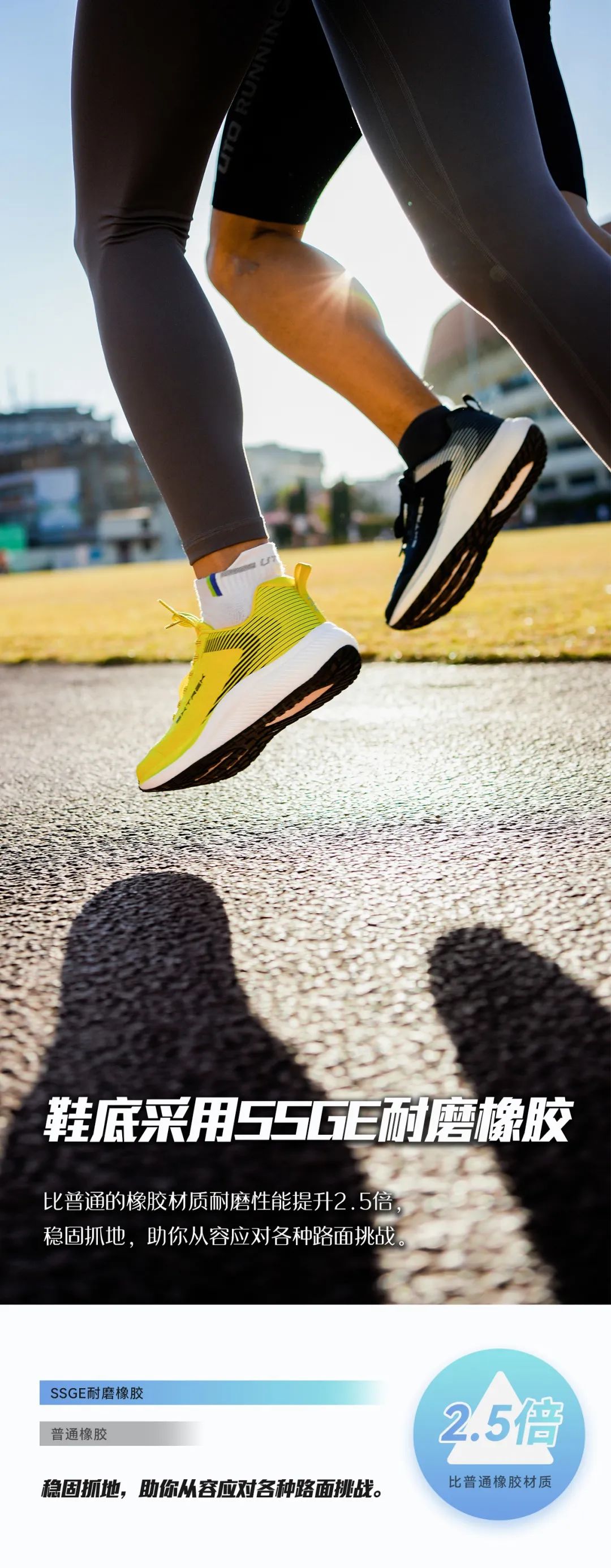 天越超临界氢弹跑鞋,大底采用SSGE耐磨橡胶,更大面积橡胶分布,防滑抓地,助你跑的更稳。