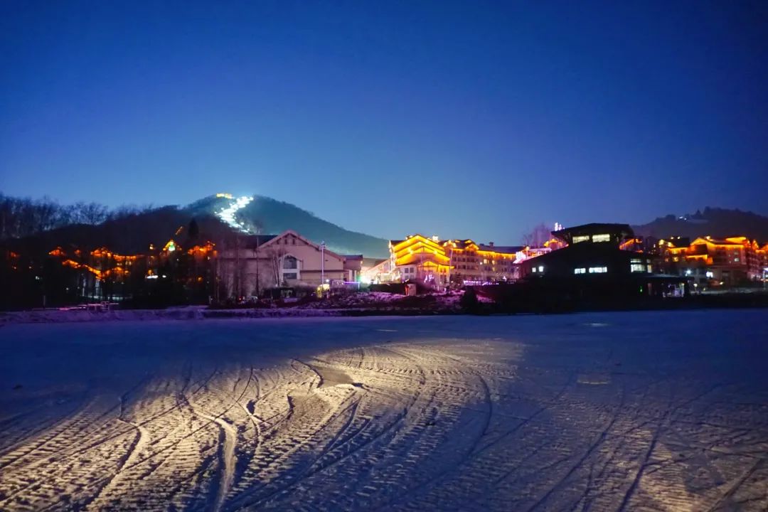 被雪地摩托探照灯照亮的冰面,还能远眺雪场山顶