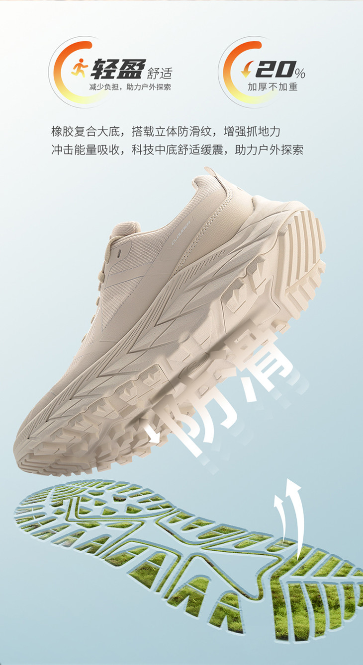 首先,这款鞋最大的亮点之一就是它的EVA加厚鞋底!什么是EVA呢?简单来说,它是一种轻便又富有弹性的材料,能够有效缓解脚部压力,让每一步都像踩在云朵上一样舒适。无论你是在山间穿梭还是在城市公园悠闲漫步,它都能给你满满的支撑和保护。