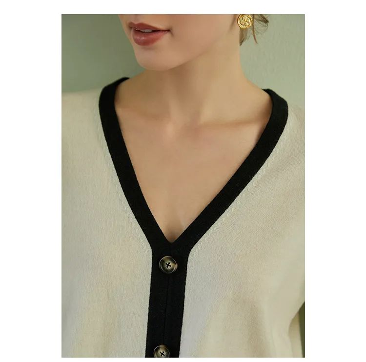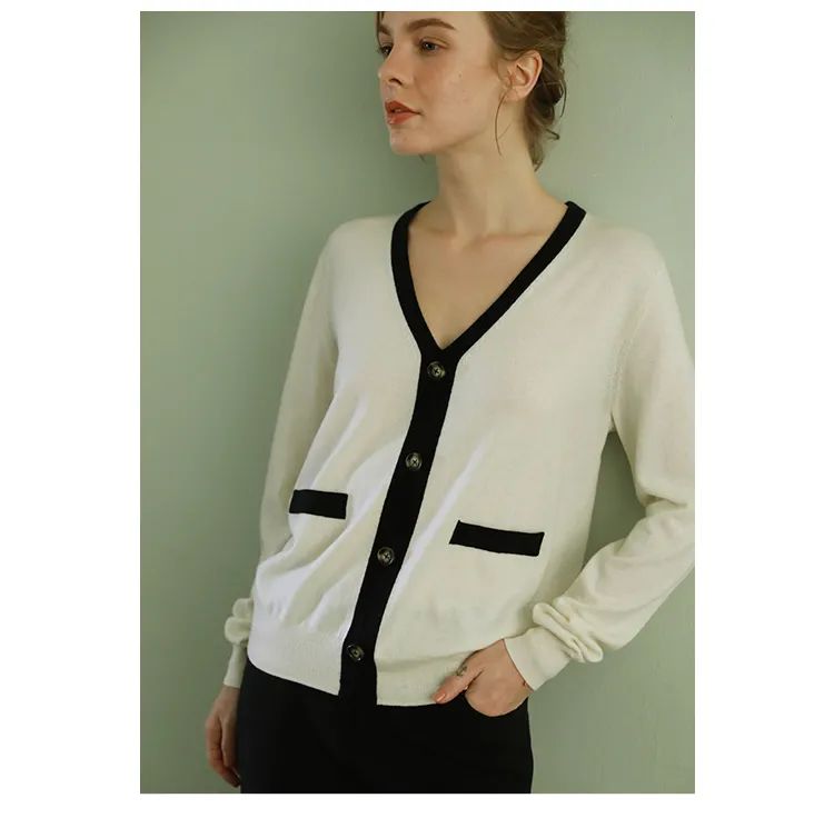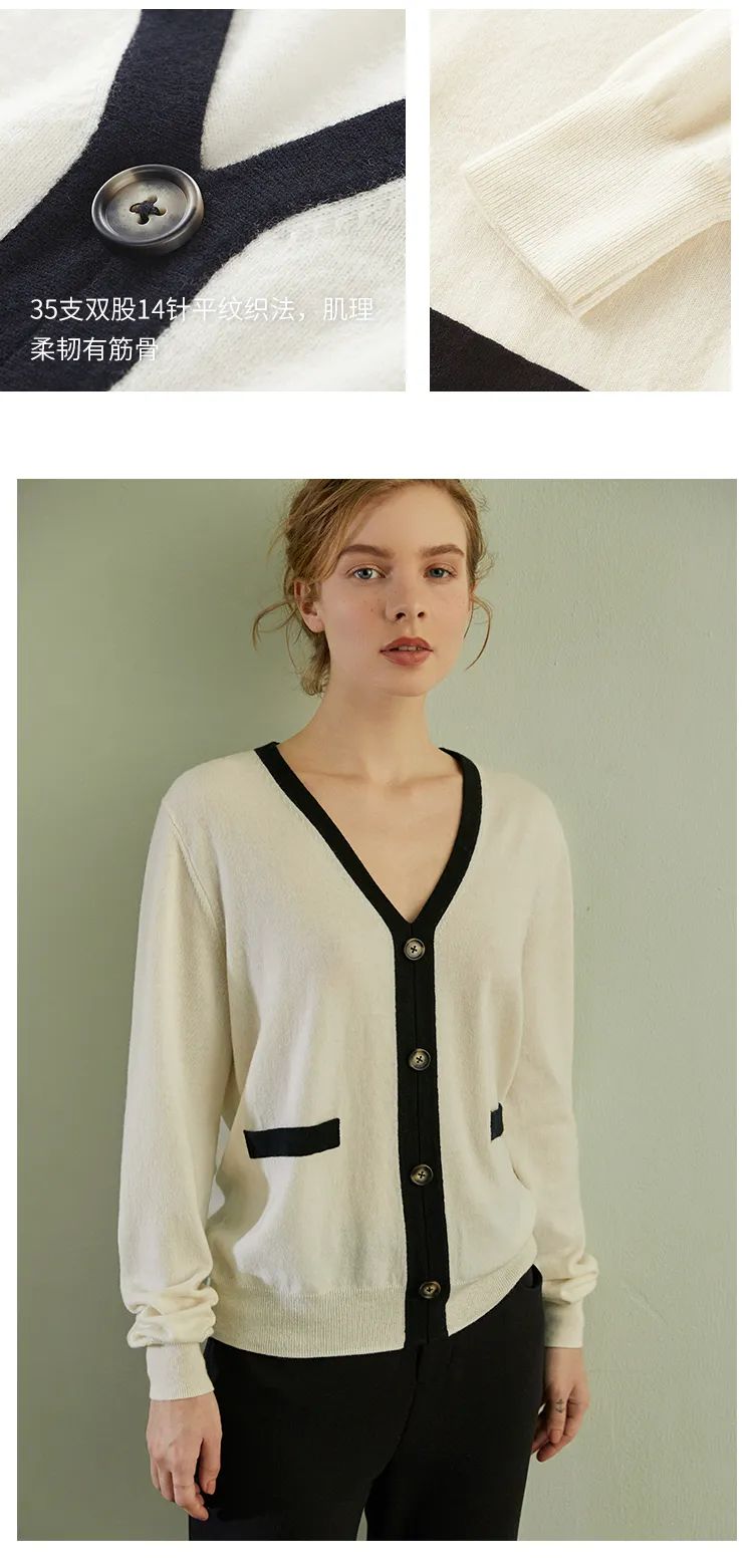这件超细美丽诺纯羊毛撞边V领套头衫,