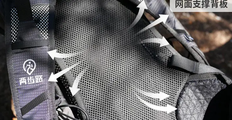 ①3D悬浮式背负系统:通过立体网面结构形成空气流通层,快速排出湿热,保持背部干爽。
