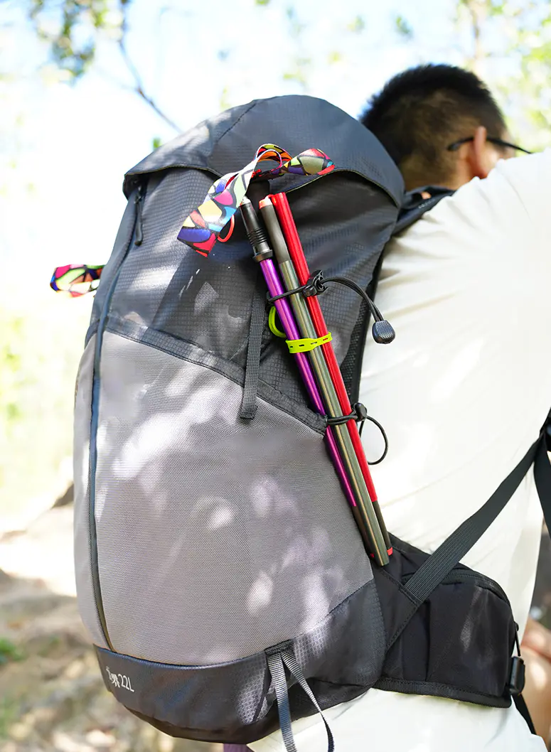 弹力绳+固定扣设计,轻松挂载登山杖、水壶,减少途中卸包次数。