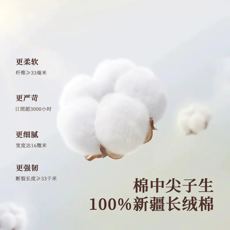 100%新疆长绒棉,纤维长度≥33毫米,日照超3000小时,被誉为“棉中尖子生”,触感柔软细腻。